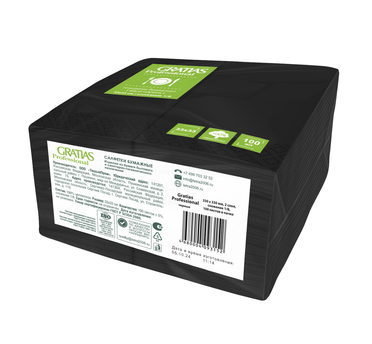 Салфетки бумажные Gratias черные двуслойные 1/8 сложенные 33 x 33см, 100шт