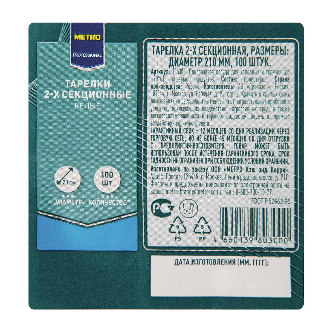 METRO PROFESSIONAL Тарелка одноразовая 2 секции из полистирола белая 21см, 100шт