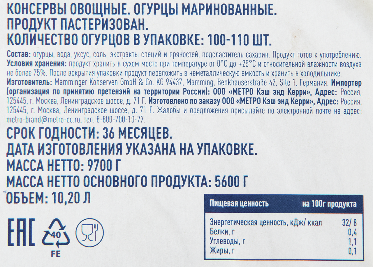 METRO Chef Огурцы маринованные 100-110шт, 10л