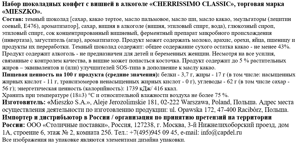 Темный шоколад [сахар, какао тертое, масло пальмовое, масло ши, масло какао, эмульгаторы лецитин соевый, E476, ароматизатор], сахар, вишня в алкоголе вишня, этиловый спирт, вода, глюкозный сироп, этиловый спирт, сок концентрированный вишневый, ферментный препарат микробного происхождения инвертаза, загуститель агар, ароматизатор.