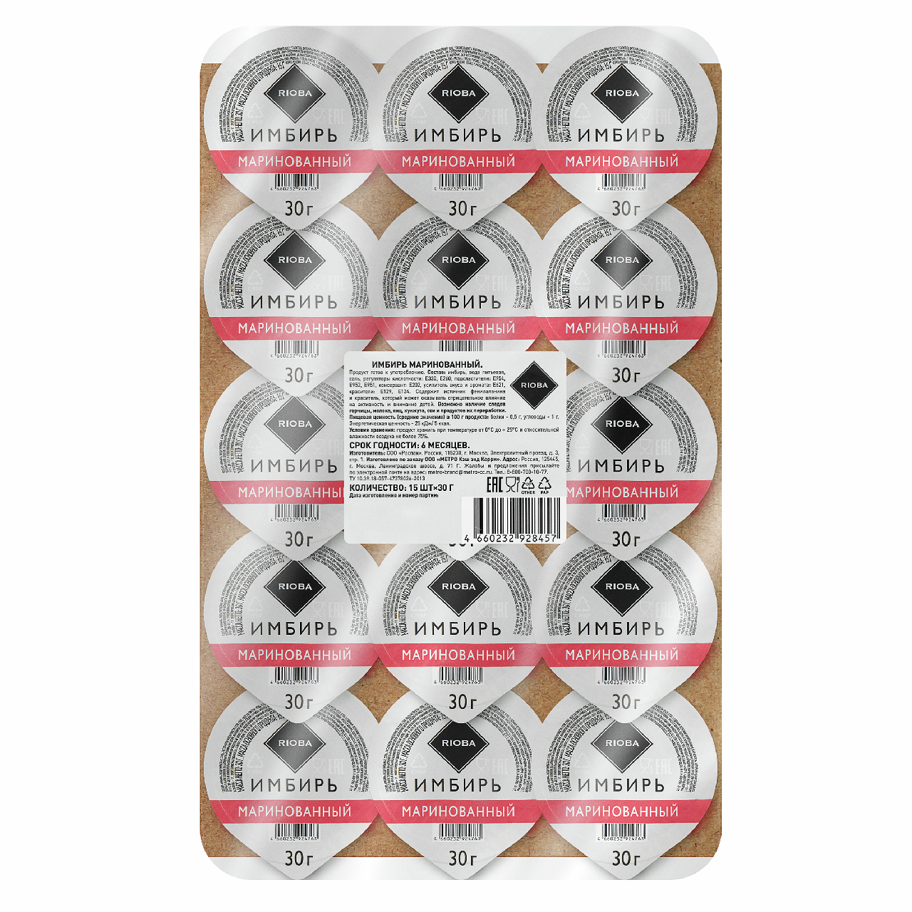 Порционный имбирь RIOBA - прекрасное дополнение к соевому соусу и васаби RIOBA. Корень многолетнего тропического травянистого растения семейства имбирных, употребляемый в качестве пряности. Добавив немного маринованного имбиря в гарнир или как отдельное блюдо (мясное, рыбное), вы сделаете вкус пищи более пряным и насыщенным. Данная приправа традиционно подается вместе с васаби и соевым соусом к суши и различным блюдам из риса и рыбы.