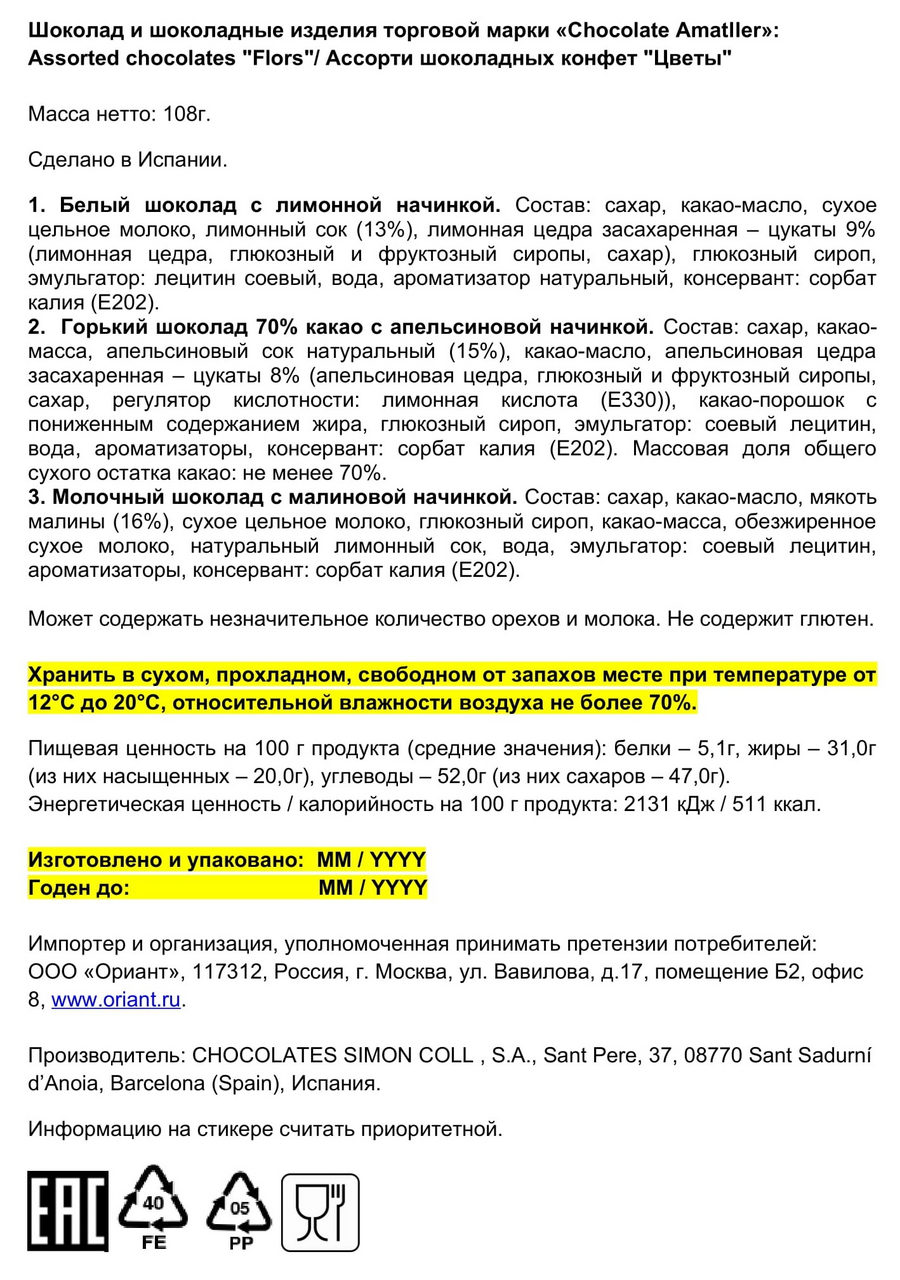 Шоколадная продукция под брендом Amatller имеет почти двухвековую историю и производятся на одной из старейших фабрик Simn Coll, расположенной в Барселоне - самом сердце Испании. Сегодня бренд Amatller один из самых узнаваемых брендов в шоколадном секторе благодаря стильным дизайнам и нестандартной упаковке.Ассорти конфет Flors в виде цветков из горького шоколада с апельсиновой начинкой, измолочного шоколада с малиновой начинкой, из белого шоколада с лимонной начинкой - неотразимое сочетание текстур и вкусов. Представлен в жестяной подарочной коробке, дизайн которой создан по мотивам старых рекламных логотипов бренда Amatller.