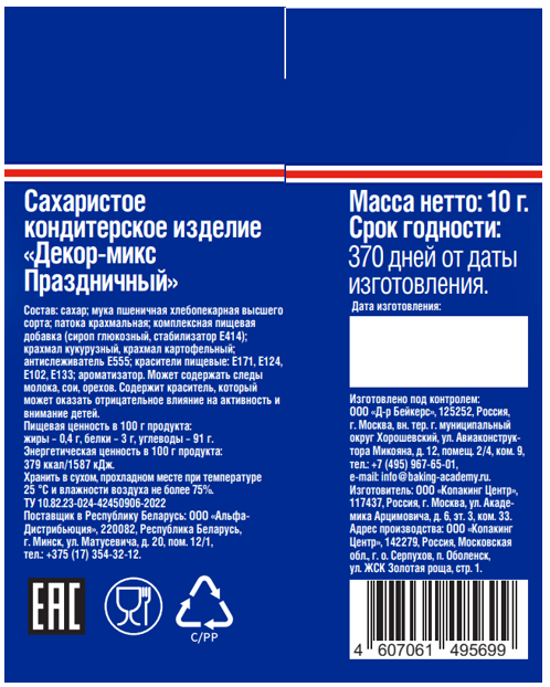 Это декоративный элемент, который применяется для украшения различных кондитерских изделий. Он выполнен в виде маленьких элементов различной формы и расцветки. Сделает домашнюю выпечку яркой и красочной. Она не тает и не расплывается, позволяя сохранить декор изделия в безупречном виде.