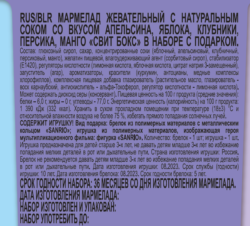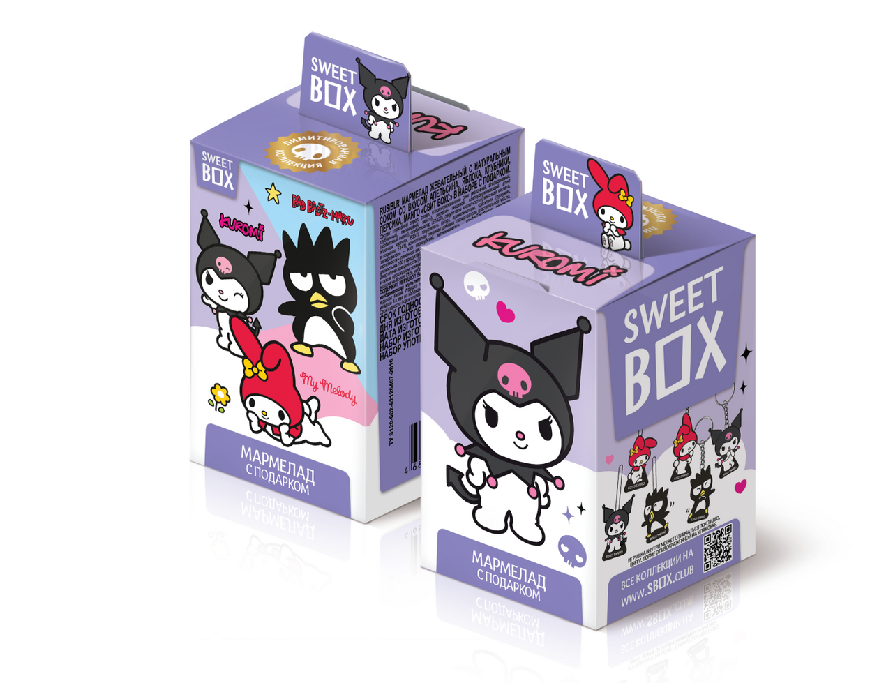 В каждой коробочке вкусный мармелад с натуральным фруктовым соком, лифлет с описанием персонажа и подарок - Брелок + пуллер. В коллекции 8 брелоков, 8 пуллеров. Это картонная коробочка с мармеладом из натурального сока и коллекционной 3Д-игрушкой в индивидуальном пакетике с дизайном и лифлетом. В качестве коллекционных вложений в коробочке Sweet Box: пуллер и брелок.