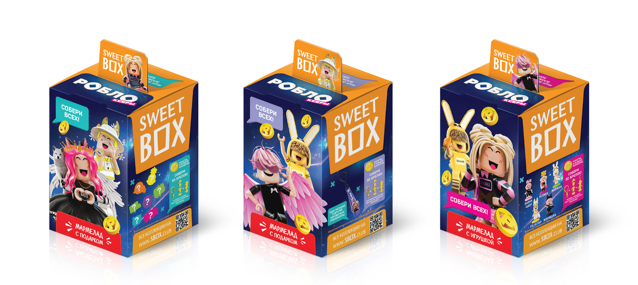 Roblox - популярная метавселенная, онлайн-игра, где пользователи общаются в виртуальном мире. Роблоксеры - популярные блогеры, создавшие своих аватаров на этой платформе. Персонажи игровой платформы мегапопулярны среди детей и подростков. В коробочках Sweet box вкусный мармелад с натуральным соком и приятный подарок: игрушка или аксессуары. Более 25 подарков в коллекции.