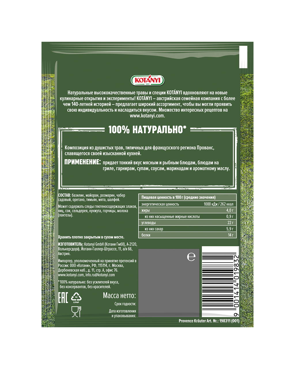 Композиция из душистых трав, типичных для французского региона Прованс, славящегося своей изысканной кухней. Приправа Прованские травы придает тонкий вкус мясным и рыбным блюдам, блюдам на гриле, гарнирам, супам, соусам, маринадам и ароматному маслу. Невероятно насыщенный вкус перенесет вас на побережье Адриатического моря. Ароматная смесь трав придаст любым блюдам неповторимый вкус средиземноморской и далматинской кухни. Это натуральная смесь, которая придаст вашим блюдам потрясающий яркий вкус и неповторимый аромат. В ее состав входят высушенные и измельченные травы Прованса.