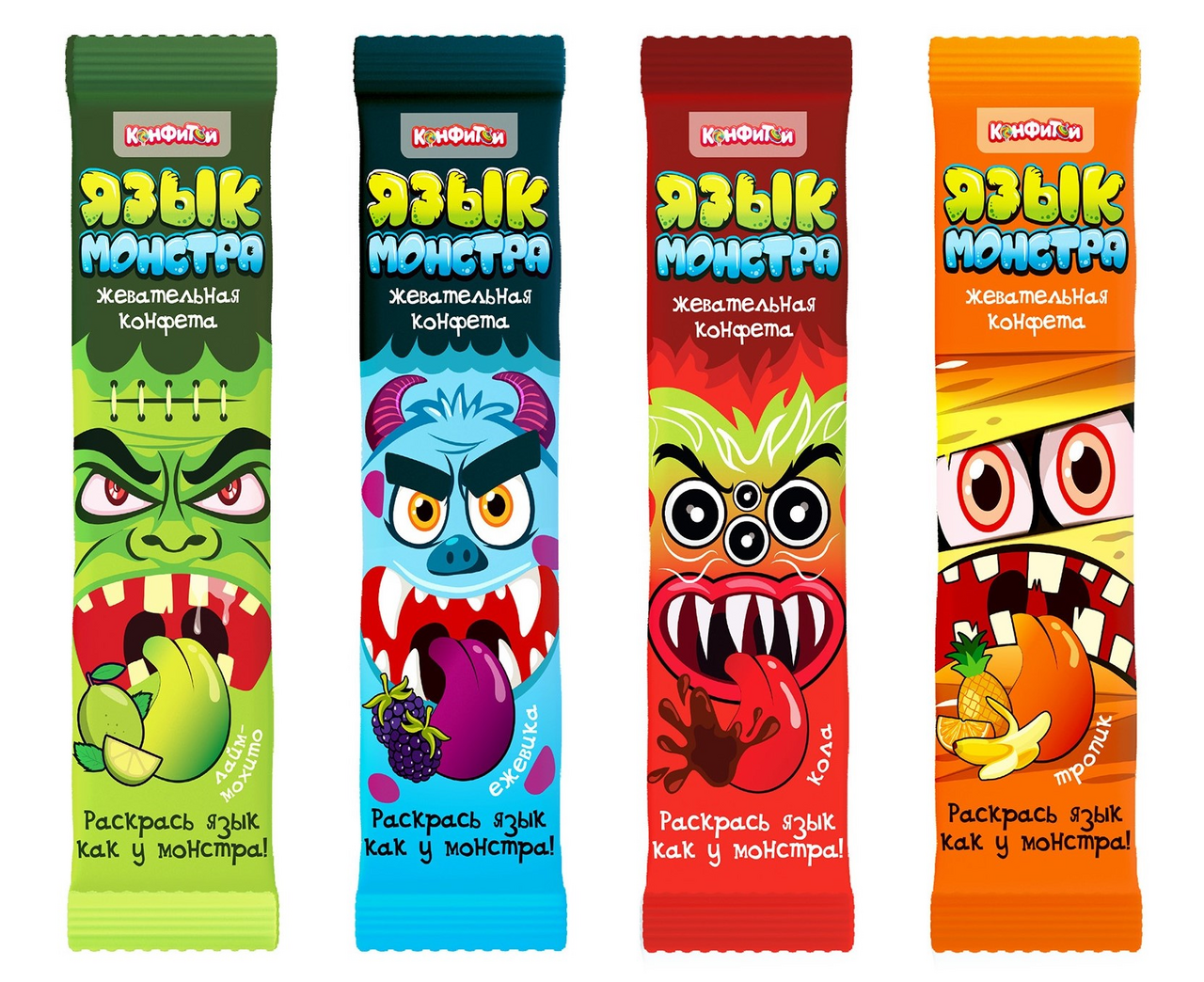 Конфета жевательная Конфитой Язык монстра ассорти, 10г x 50 шт со вкусом колы, ежевики, тропик и лайма-мохито. Раскрась язык как у монстра и удиви друзей необычной конфетой. Четыре вкуса жевательной конфеты: попробуй их все.