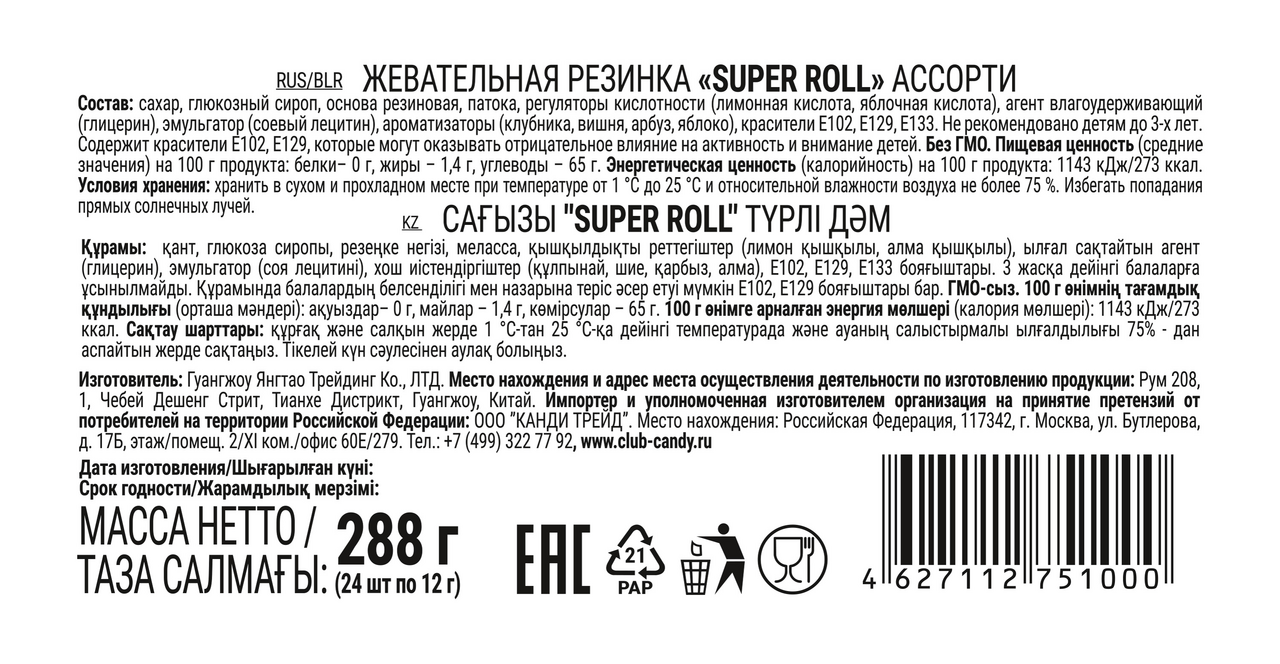 Жевательная резинка Канди клаб Super Roll Ассорти, 10г