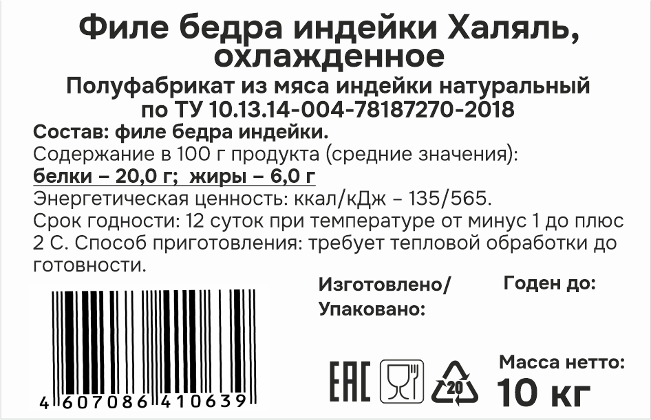 Филе бедра индейки Большая птица Халяль охлажденное, ~10кг - отличный вариант для жарки. Мясо индейки диетическое. В сравнении с мясом другой птицы в нем мало холестерина. Оно легко усваивается и легко переваривается. Идеально подходит для приготовления супов, а также запекания в духовом шкафу на противне, в фольге или в рукаве. Эту часть тушки птицы можно мариновать в специях и соусах, а после обжаривать на гриле до золотистой хрустящей корочки. Из филе бедра индейки получается вкусный домашний фарш для сочных котлет, биточков, зраз и любых начинок. Эта часть считается одной из самых сочных и плотных. Ее можно использовать для жарки, запекания, приготовления супов и плова. Мясо без кости отлично подходит для создания котлет, рулетиков и других изделий.