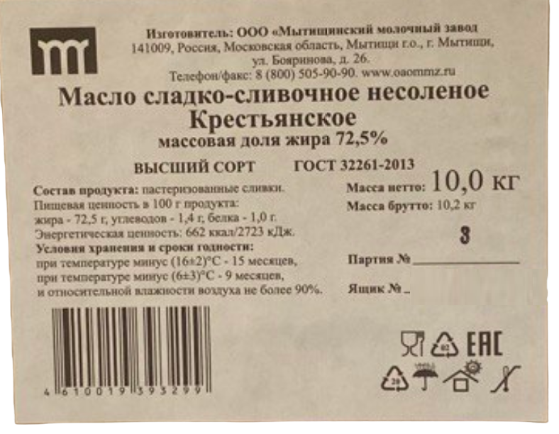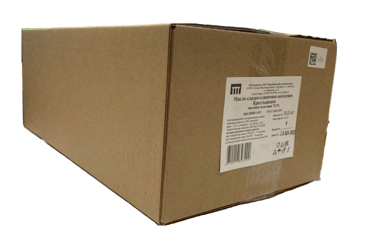 Масло крестьянское сладко-сливочное несоленое замороженное 72.5%, 10кг