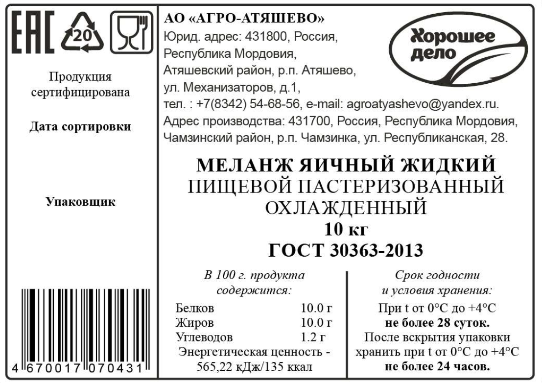 Меланж яичный Хорошее дело жидкий пастеризованный охлажденный, 10кг