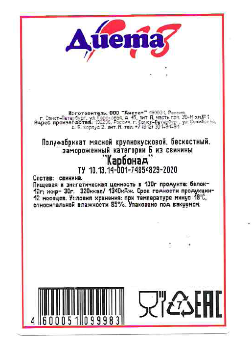 Карбонад свиной Диета18 без кости замороженный, ~10кг