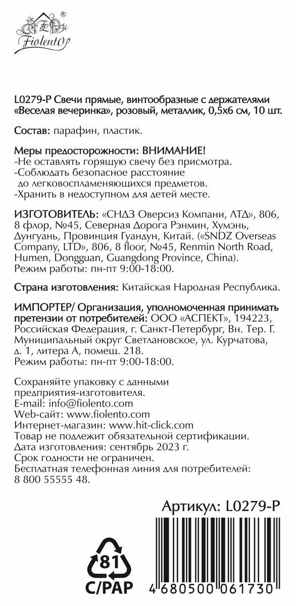 Свечи прямые Fiolento с держателем розовый-металлик, 10шт