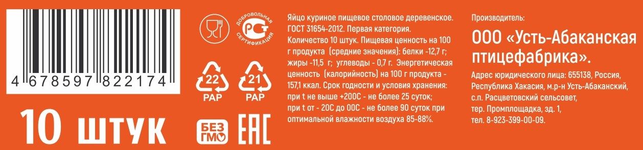 Яйцо куриное Усть-Абаканская птицефабрика Деревенское С1, 10шт