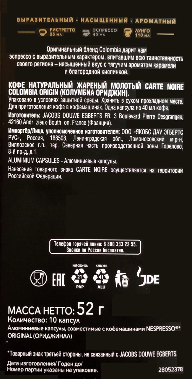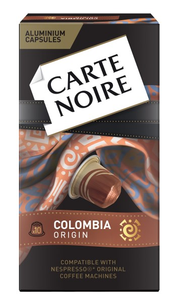 Кофе в алюминиевых капсулах Carte Noire Colombia Origin, 100% арабика. Выразительный, насыщенный, ароматный. Оригинальный бленд Colombia дарит нам эспрессо с выразительным характером, впитавшим всю таинственность своего региона – насыщенный вкус с тягучим ароматом карамели и благородной кислинкой.