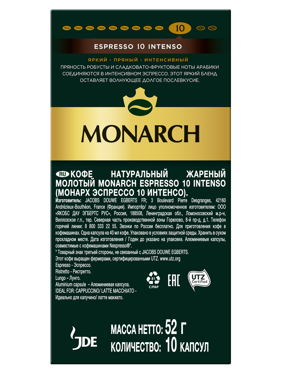 Кофе в капсулах Monarch Espresso 10 Intenso для кофемашин Nespresso 10шт, 52г