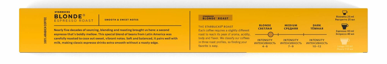 Starbucks Blonde Espresso Roast, кофе жареный молотый светлой обжарки, в алюминиевых капсулах для системы Nespresso, 100% Арабика, 10 шт. Ноты: Эспрессо самой слабой обжарки с нежным и мягким вкусом. Интенсивность: 6 из 12 Размер чашки: Ристретто (25 мл) или Эспрессо (40 мл). Обжарка: Blonde - светлая, обладает легким и ярким вкусом. Каждый вид кофе требует различной степени обжарки для достижения оптимального соотношения аромата, кислинки, плотности кофе и вкуса. Мы разделяем наш кофе на три вида обжарки Blonde, Medium и Dark, чтобы вы легко могли найти свой любимый кофе.