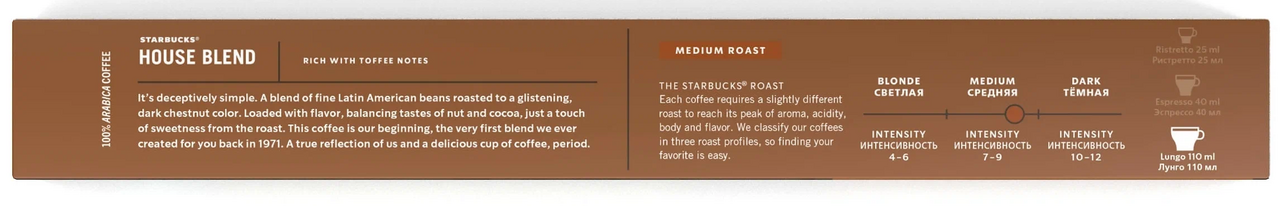 Starbucks House Blend, кофе жареный молотый средней обжарки, в алюминиевых капсулах для системы Nespresso, 100% арабика, 10 штук.Ноты: сбалансированное сочетание аромата, консистенции и вкуса с нотками обжаренных орехов и какао-бобов.Интенсивность: 8 из 12.Размер чашки: Лунго (110 мл).Обжарка: Medium - средняя, обладает сбалансированным, мягким и насыщенным вкусом.Каждый вид кофе требует различной степени обжарки для достижения оптимального соотношения аромата, кислинки, плотности кофе и вкуса. Starbucks разделяет кофе на три вида обжарки Blonde, Medium и Dark, чтобы вы легко могли найти свой любимый кофе.Бленд из отборных кофейных зерен из Латинской Америки, обжаренных до темно-коричневого цвета. Сочетание насыщенного аромата и вкуса орехов и какао-бобов с едва заметными сладкими нотками.