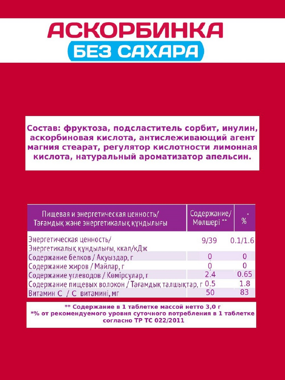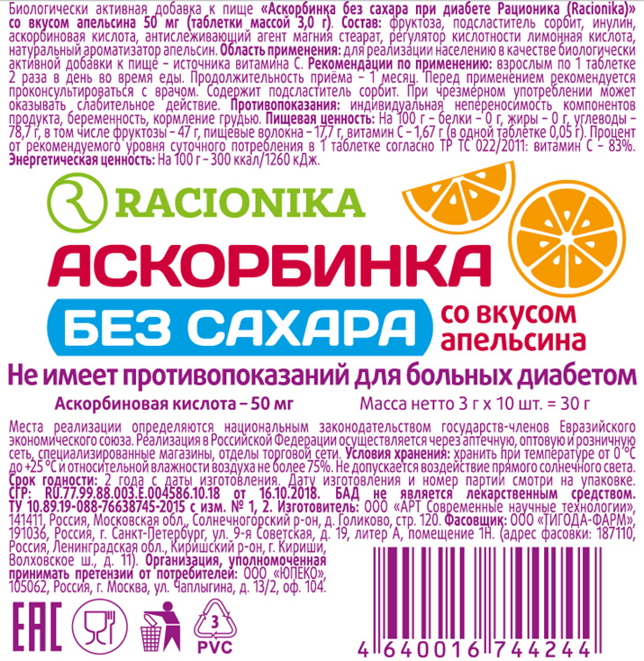 Диабетическая аскорбинка Racionika Сахар-контроль - дополнительный источник витамина С. Дополнительно в состав диабетической аскорбинки Racionika Сахар-контроль входит пребиотик инулин. Диабетическая аскорбинка не содержит сахара и глюкозы.