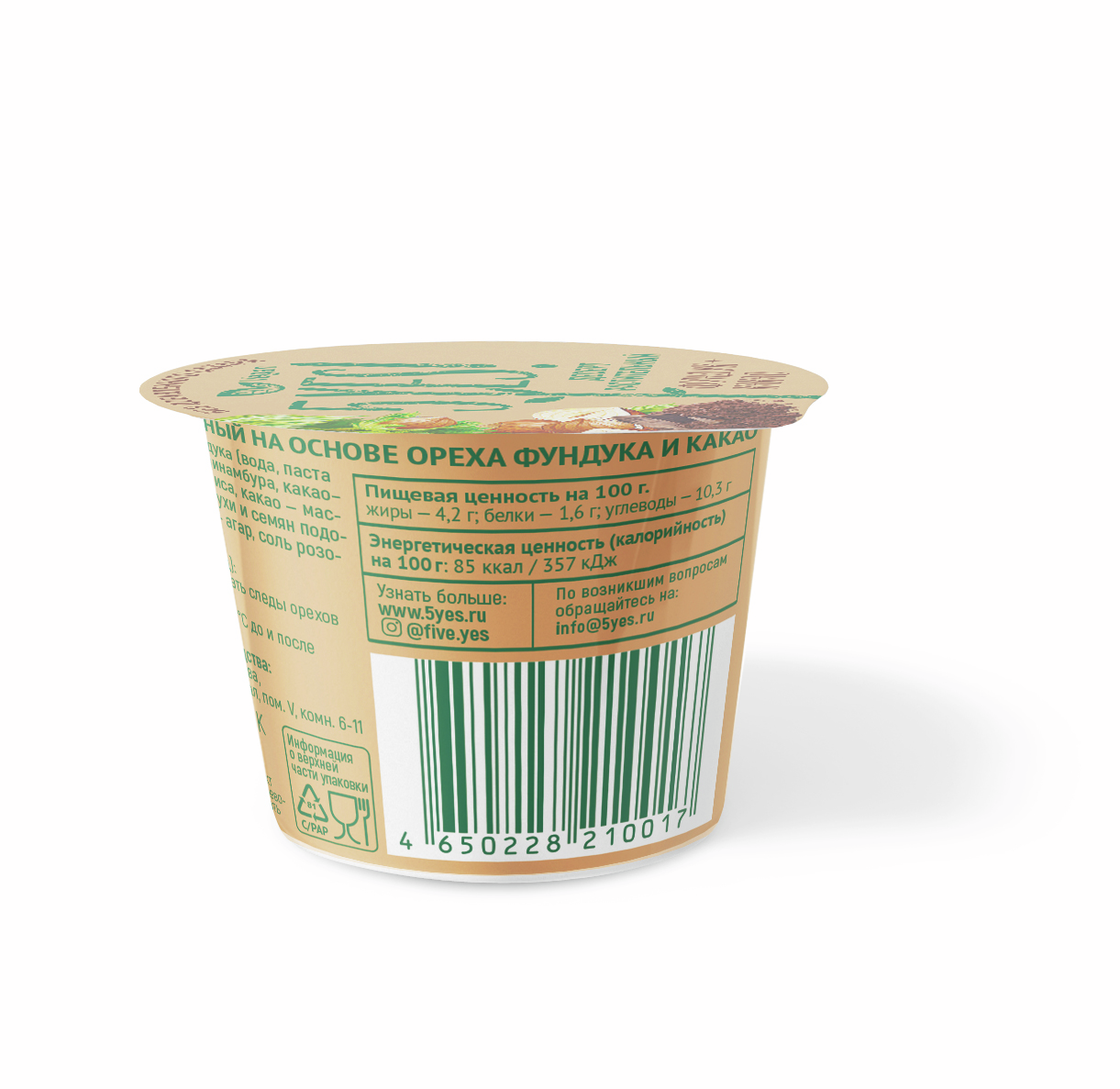 Десерт 5Yes! На растительной основе фундук-какао, 110г - это воздушное лакомство с однородной текстурой и в меру сладким вкусом. Полезный растительный продукт не содержит глютена, сахара, лактозы и крахмала. Нежное лакомство легко усваивается, не оставляя тяжести в желудке. Оно прекрасно подойдет для тех, у кого есть непереносимость лактозы. Питательный завтрак без вреда для здоровья. Десерт отлично поднимет настроение, зарядит энергией на весь день. За счет практичной упаковки продукт можно взять с собой в дорогу и в офис.