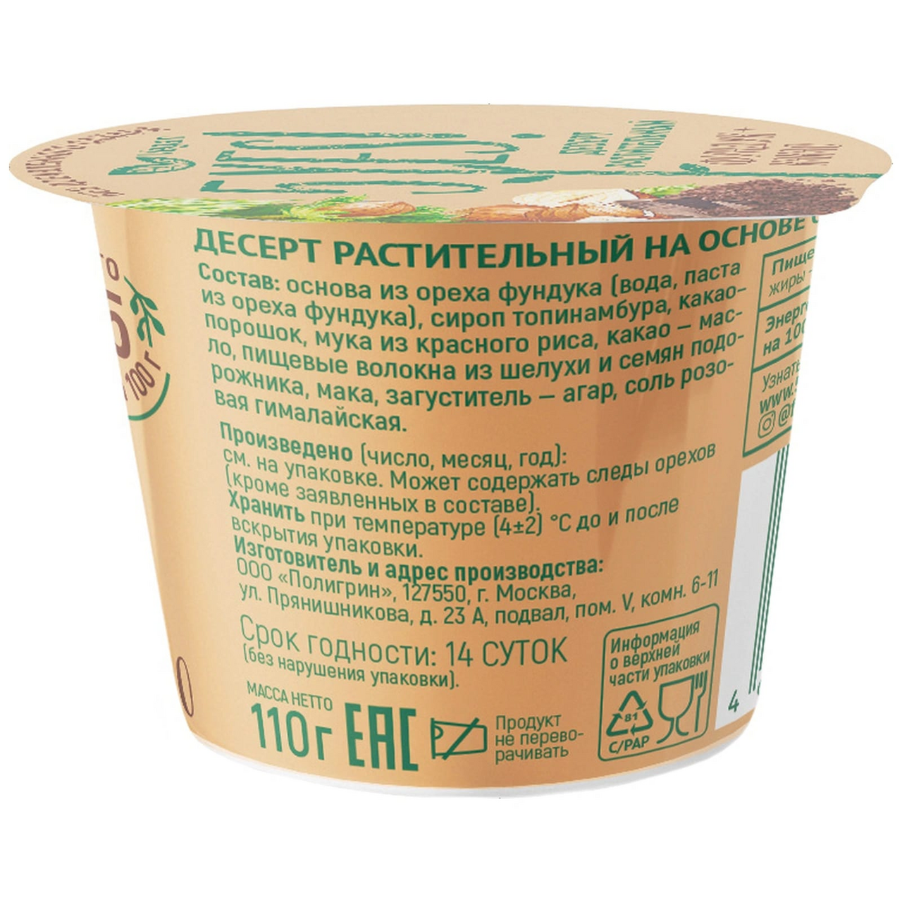 Основа из ореха фундука (вода, паста из ореха фундука), сироп топинамбура, какао-порошок, мука из красного риса, какао-масло, пищевые волокна из шелухи и семян подорожника, мака, загуститель - агар, соль розовая гималайская.
