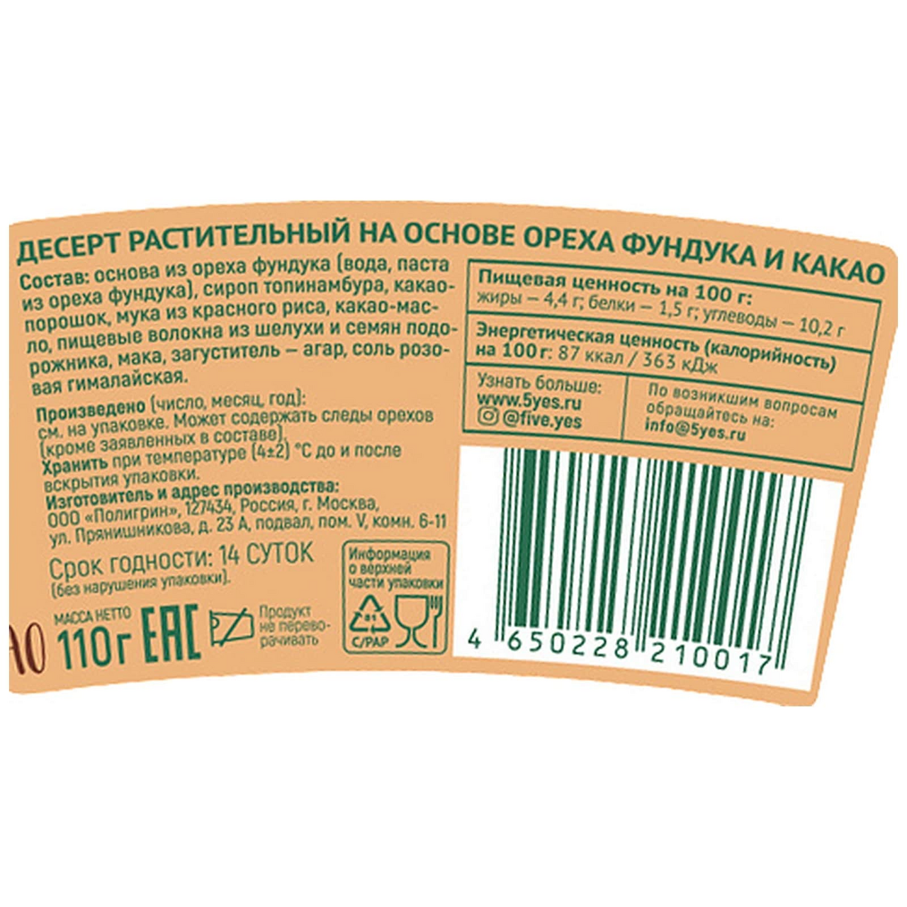 Десерт 5Yes! На растительной основе фундук-какао, 110г