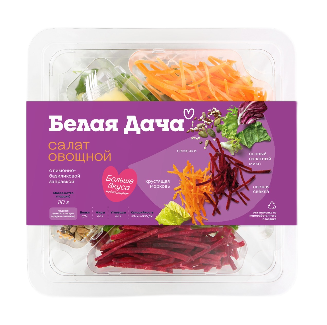 Салат Овощной с цитрусовой заправкой внутри - идеальный вариант для быстрого и лёгкого перекуса. Белая Дача представляет новую серию полноценных блюд — готовые салаты в удобных раздельных упаковках, разработанные бренд-шефом Белая Дача Филиппом Ковальчуком. Мы специально не стали смешивать продукты в упаковке и не добавили заправку в момент приготовления, чтобы гарантировать безопасность и удобный срок хранения салатных блюд. Каждый ингредиент наших салатов на 100% готов к столу: осталось только открыть, добавить фирменный соус и перемешать. Внутри салатного бокса есть биоразлагаемая вилка, а сама упаковка произведена из перерабатываемого пластика.