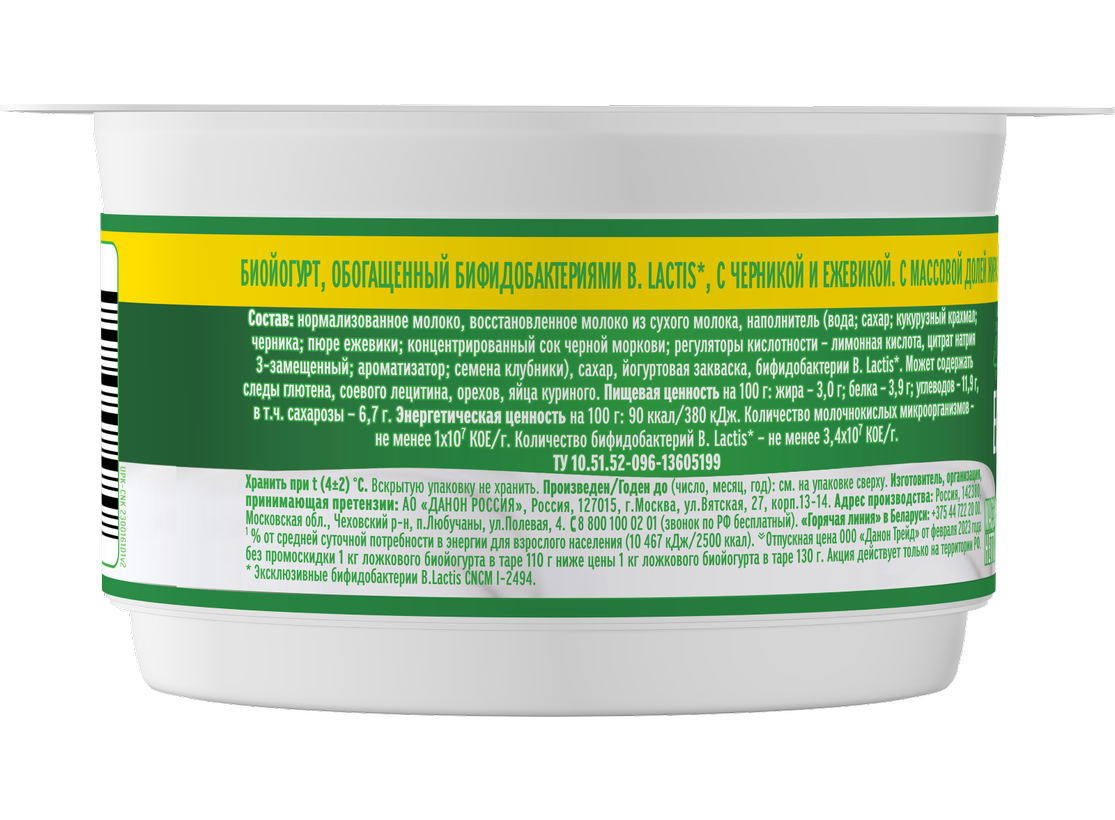 Нормализованное молоко, восстановленное молоко из сухого молока, наполнитель (вода; сахар; кукурузный крахмал; черника; пюре ежевики; концентрированный сок черной моркови; регуляторы кислотности – лимонная кислота, цитрат натрия 3-замещенный; ароматизатор; семена клубники), сахар, йогуртовая закваска, бифидобактерии B. Lactis*. Может содержать следы глютена, соевого лецитина, орехов, яйца куриного. Количество молочнокислых микроорганизмов – не менее 1x107 КОЕ/г. Количество бифидобактерий B. Lactis* – не менее 3,4x107 КОЕ/г.