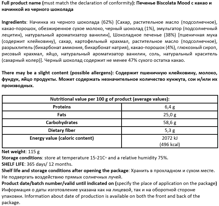 Начинка из черного шоколада (62%) (сахар, растительное масло (подсолнечное), какао-порошок, обезжиренное сухое молоко, черный шоколад (1%), эмульгатор (подсолнечный лецитин), натуральный ароматизатор ванилин). Шоколадное печенье (38%) (пшеничная мука (содержит клейковину), сахар, картофельный крахмал, растительное масло (подсолнечное), разрыхлитель (бикарбонат аммония, бикарбонат натрия), какао-порошок (4%), глюкозный сироп, рисовый крахмал, яйцо, натуральный ароматизатор ванилин, соль, натуральный краситель (сахарный колер)).