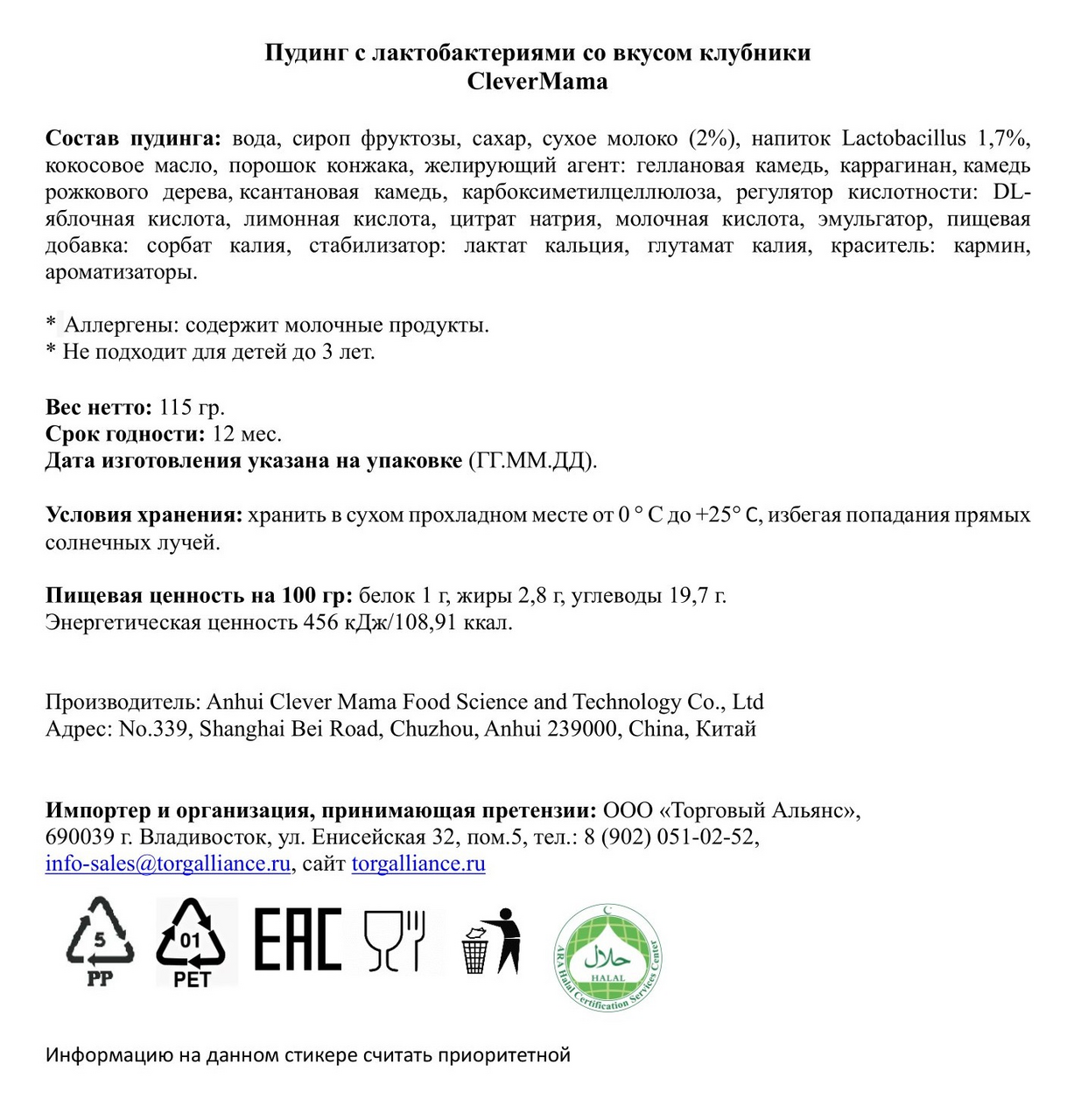 Пудинг Clever Mama с лактобактериями и клубникой, 115г