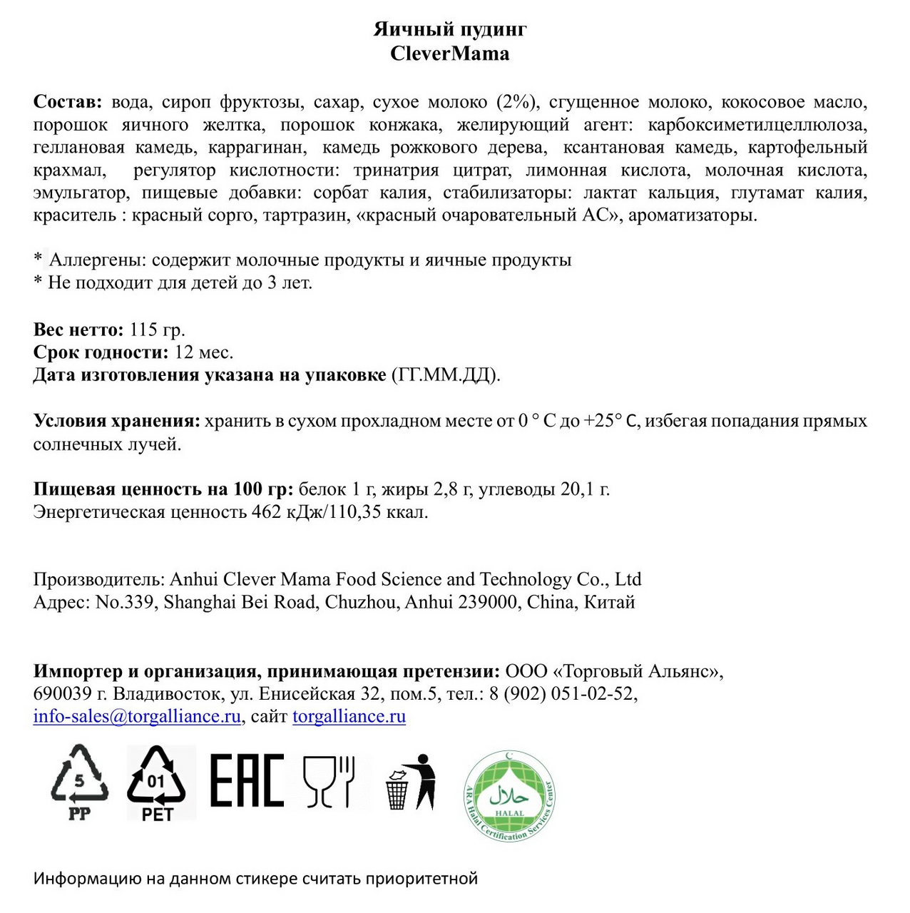 Пудинг Clever Mama яичный, 115г