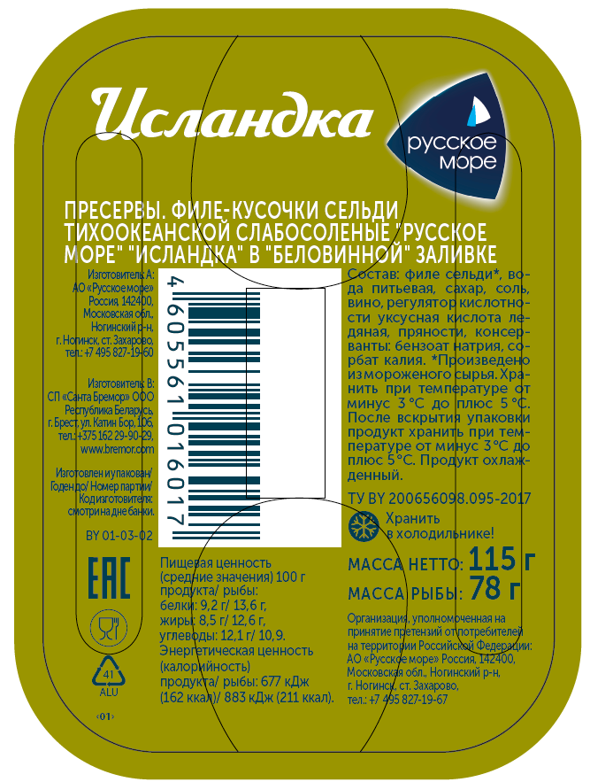 Сельдь Русское море Исландка в беловинной заливке, 115г