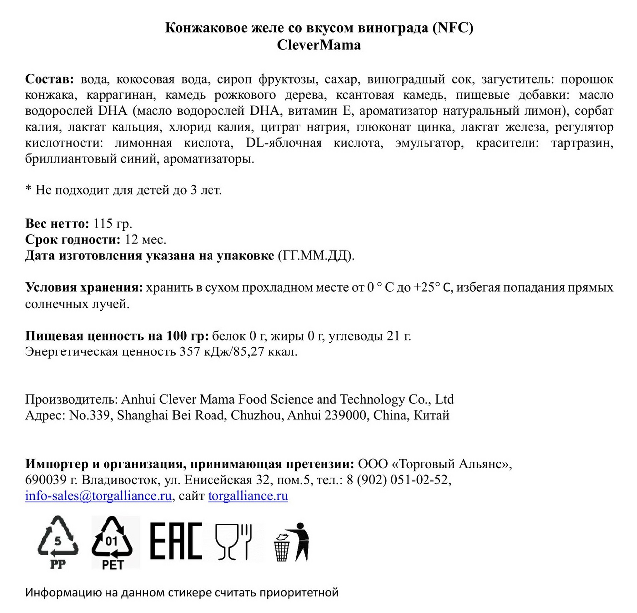 Желе Clever Mama Конжаковое виноград, 115г