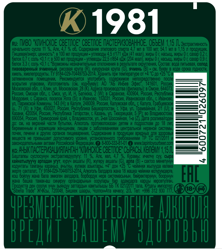 Клинское - пиво для друзей с 1981 года, один из первых оригинальных брендов пива в России . Рецептура Клинского Светлого отличается от других сортов использованием уникальной комбинации трех видов основного сырья – пивоваренного солода, качественного ячменя и дробленого риса. Каждый вид делится с Клинским своими особенностями – пивоваренный солод отвечает за зерновой вкус пива, ячмень придает сорту полноту вкуса, а рис добавляет мягкость и завершает эту композицию.