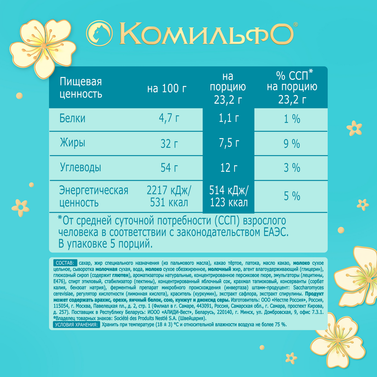 Сахар, жир специального назначения (из пальмового масла), какао тертое, патока, масло какао, молоко сухое цельное, сыворотка молочная сухая, вода, молоко сухое обезжиренное, молочный жир, агент влагоудерживающий (глицерин), глюкозный сироп (содержит глютен), ароматизаторы натуральные, концентрированное персиковое пюре, эмульгаторы (лецитины, е476), спирт этиловый, стабилизатор (пектины), концентрированный яблочный сок, крахмал тапиоковый, консерванты (сорбат калия, бензоат натрия), ферментный препарат микробного происхождения (инвертаза) штамм-продуцент: saccharomyces cerevisiae, регулятор кислотности (лимонная кислота), краситель (куркумин), экстракт сафлора, экстракт спирулины.