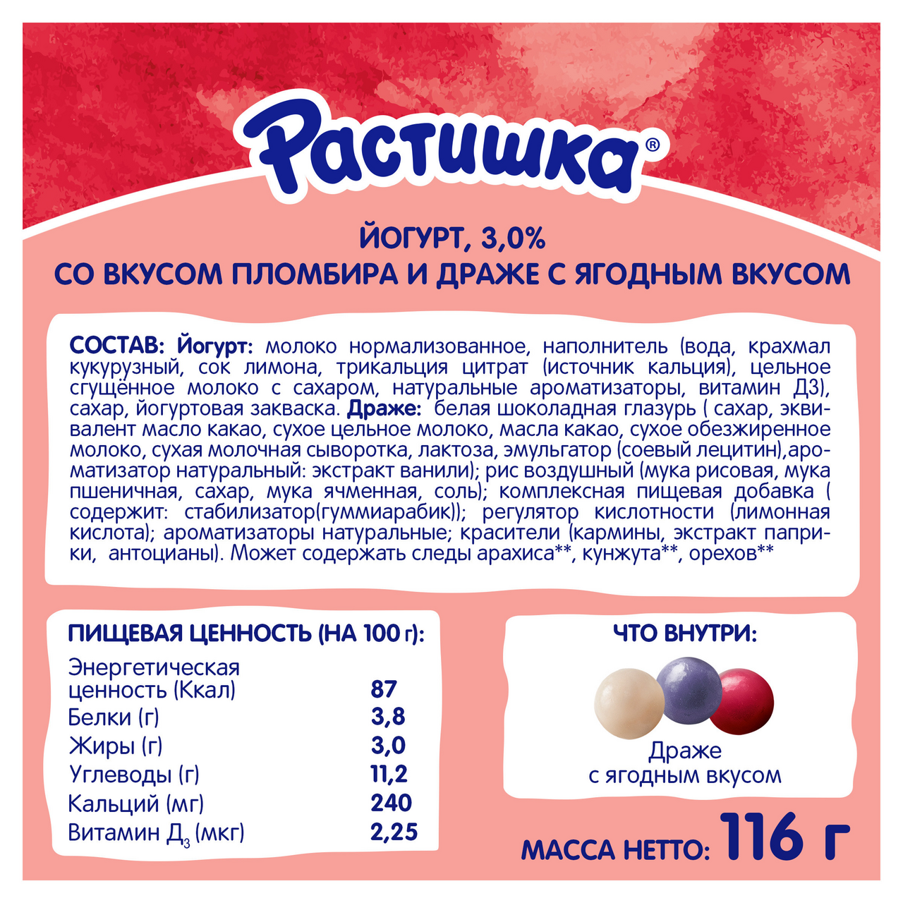 Растишка йогурт со вкусом пломбира и хрустящим драже с ягодным вкусом изготовлен из отборного молока с использованием йогуртовой закваски, а также спелых ягод от проверенных поставщиков. В продукте кальций и витамин D3, необходимые для здорового роста и развития малыша. Необычный формат позволяет детям самим решать, смешивать йогурт с печеньем или есть отдельно. Подходит для детей старше 3 лет.