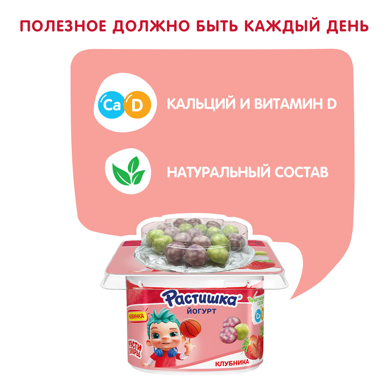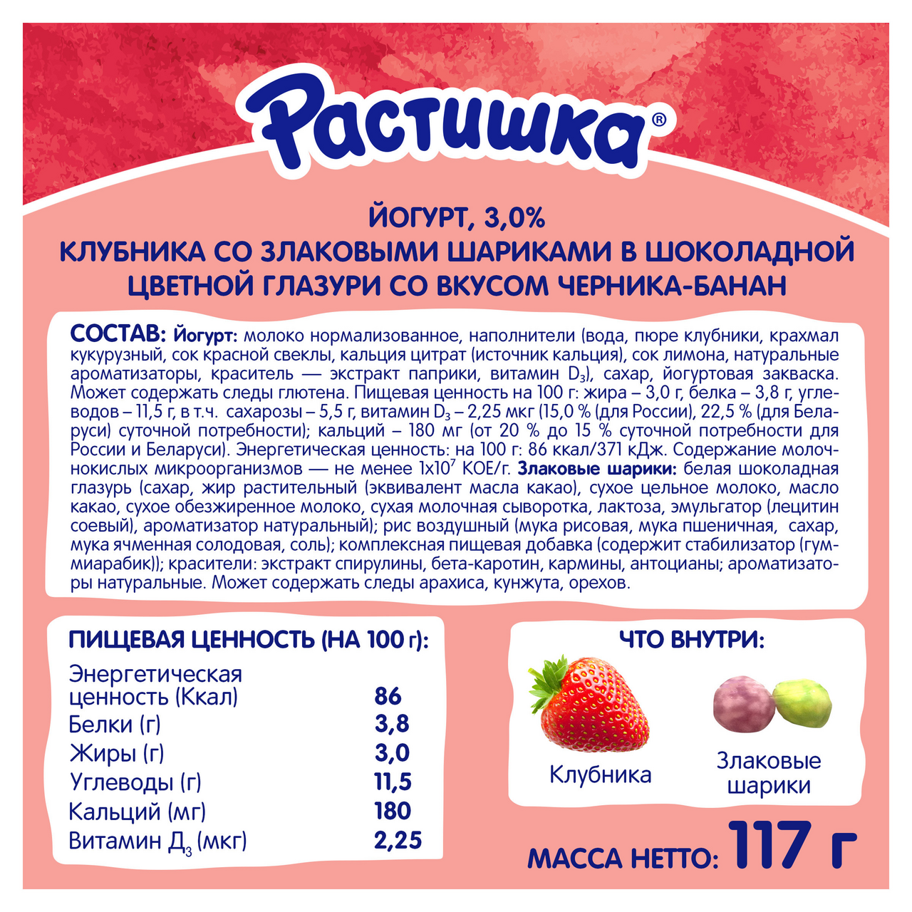 Йогурт: молоко нормализованное, наполнители (вода, пюре клубники, крахмал кукурузный, сок красной свеклы, кальция цитрат (источник кальция), сок лимона, натуральные ароматизаторы, краситель — экстракт паприки, витамин D3), сахар, йогуртовая закваска. Злаковые шарики: белая шоколадная глазурь (сахар, жир растительный (эквивалент масла какао), сухое цельное молоко, масло какао, сухое обезжиренное молоко, сухая молочная сыворотка, лактоза, эмульгатор (лецитин соевый), ароматизатор натуральный), рис воздушный (мука рисовая, мука пшеничная, сахар, мука ячменная солодовая, соль), комплексная пищевая добавка (содержит стабилизатор (гуммиарабик)), красители: экстракт спирулины, бета-каротин, кармины, антоцианы, ароматизаторы натуральные.