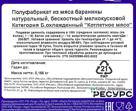 Котлетное мясо из мяса баранины Благояр охлажденное, ~1.1кг