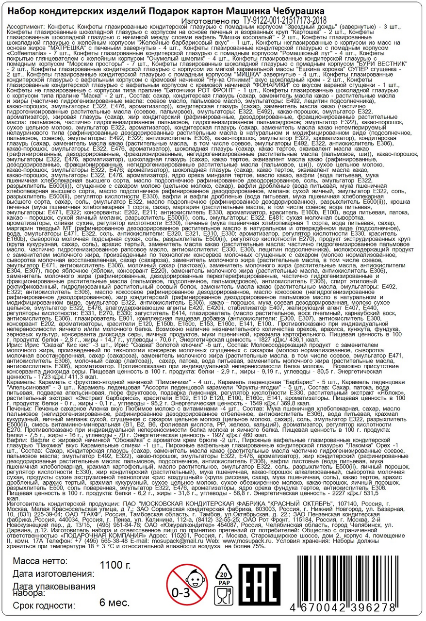 Содержит кондитерские изделия кондитерских фабрик Красный Октябрь, Пензенская кондитерская фабрика, Рот Фронт, Сормовская кондитерская фабрика, ТАКФ, Южуралкондитер. Один из самых известных героев советских мультфильмов, Чебурашка Забавный персонаж не оставит равнодушным ни одного ребенка. Такой презент станет приятным дополнением к новогоднему торжеству и здорово впишется в весёлую атмосферу детского праздника. Кондитерские изделия упакованы в отдельный пластиковый пакет, который находится внутри картонной коробочки.
