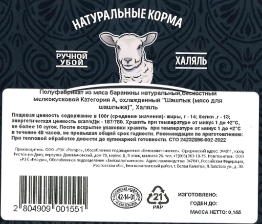 Шашлык из мяса баранины An-Noor Халяль охлажденный, ~1.1кг