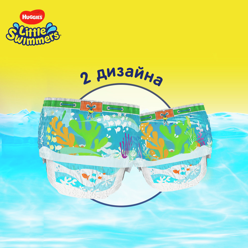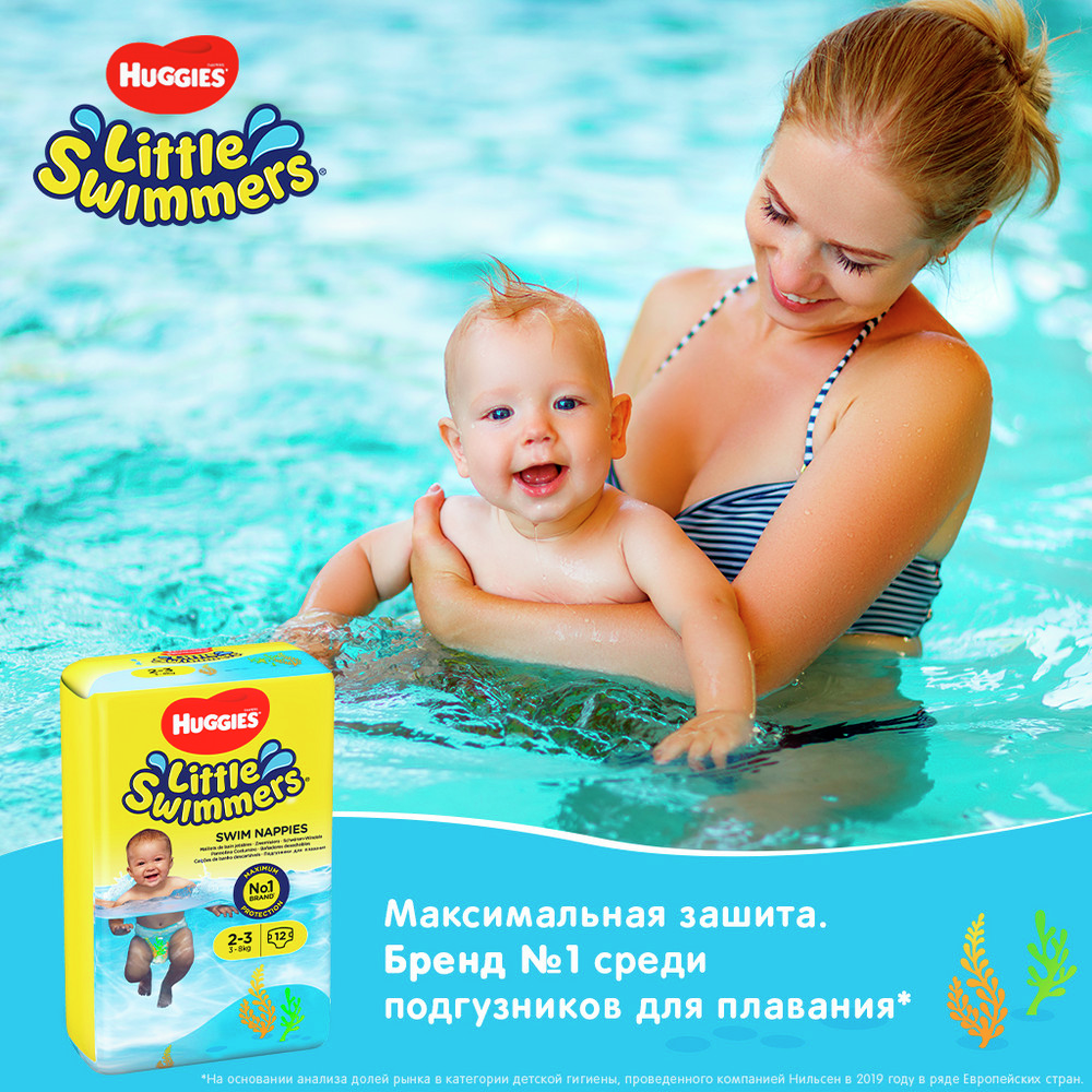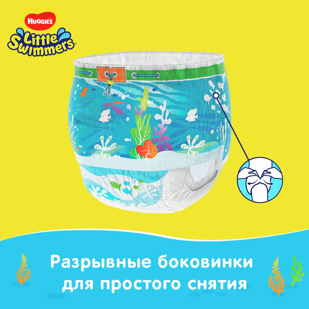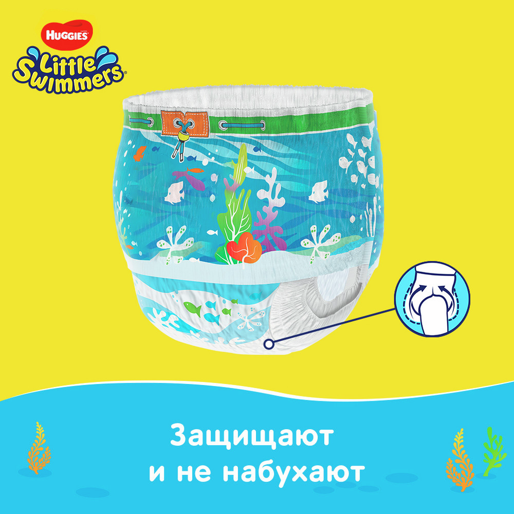 Huggies Little Swimmers — бренд No 1 в Европе среди подгузников для плавания*! Подгузники-трусики Huggies Little Swimmers созданы специально для плавания в бассейне и обеспечивают максимальную защиту от протекания. Трусики подгузники Хаггис Литтл Свиммерс имеют впитывающий слой, изготовленный из особого материала, который не набухает. С одноразовыми подгузниками-трусиками Little swimmers вы можете не опасаться неожиданностей, по��а ваш малыш наслаждается плаванием в море или бассейне. Huggies Little Swimmers рекомендованы для использования в бассейне и море, обеспечивая максимальный комфорт во время плавания! Защищают кожу и не набухают в воде. Эластичный поясок для лучшего прилегания – адаптируется к меняющимся размерам животика. Защита от протекания — надежность во время плавания в открытой воде и бассейне. Мягкие эластичные резиночки вокруг ножек обеспечивают дополнительную защиту от протекания. Легко надеть — просто натяните трусики, легко снять — разорвите боковой шов. Два замечательных универсальных дизайна подойдут для мальчиков и девочек. Выбрать подходящий размер – очень легко, ориентируясь на вес малыша: подгузники трусики Huggies Little Swimmers для плавания3-4 размерподойдут на малыша весомот 7 до 15кг, подгузники трусики Huggies Little Swimmers для плавания5-6 размерподойдут на малыша весомот 12 до 18кг, подгузники Huggies Little Swimmers для плавания2-3 размерподойдут на малыша весомот 3 до 8кг. Пожалуйста, оставьте отзыв о подгузниках-трусиках для плавания Huggies Little swimmers – Ваше мнение важно для нас!Рекомендуем попробовать наши влажные салфетки для чувствительной кожи Huggies Elite Soft, они обеспечат дополнительный уход за кожей вашего малыша. Попробуйте наши супердышащие** подгузники трусики нового поколения Huggies Elite Soft, которые созданы специально для нежной заботы о коже вашего малыша в течение дня! А ночные подгузники трусики Huggies Elite Soft с усиленным впитывающим слоем созданы специально для комфортной ночи! Ваш малыш спокойно проспит всю ночь.*На основании анализа долей рынка в категории детской гигиены, проведенного компанией Нильсен в 2015 году в ряде европейских стран.** По сравнению с предыдущей версией продукта. Лабораторное исследование KimTech East, май 2021, Китай