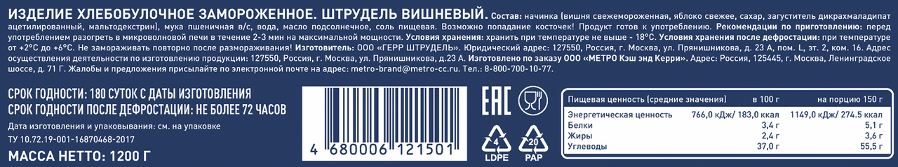 METRO Chef Штрудель вишневый 8 порций замороженный, 1.2кг – это прекрасная идея десерта для подачи на праздничный стол. Продукт изготовлен по традиционному рецепту из натуральных ингредиентов, поэтому отличается классическим вкусом и ароматом. Благодаря особой технологии заморозки после разогревания все качества штруделя остаются неизменными. Лакомство можно держать в морозильной камере на случай прихода нежданных гостей, оно будет готово за 3 минуты в микроволновой печи.