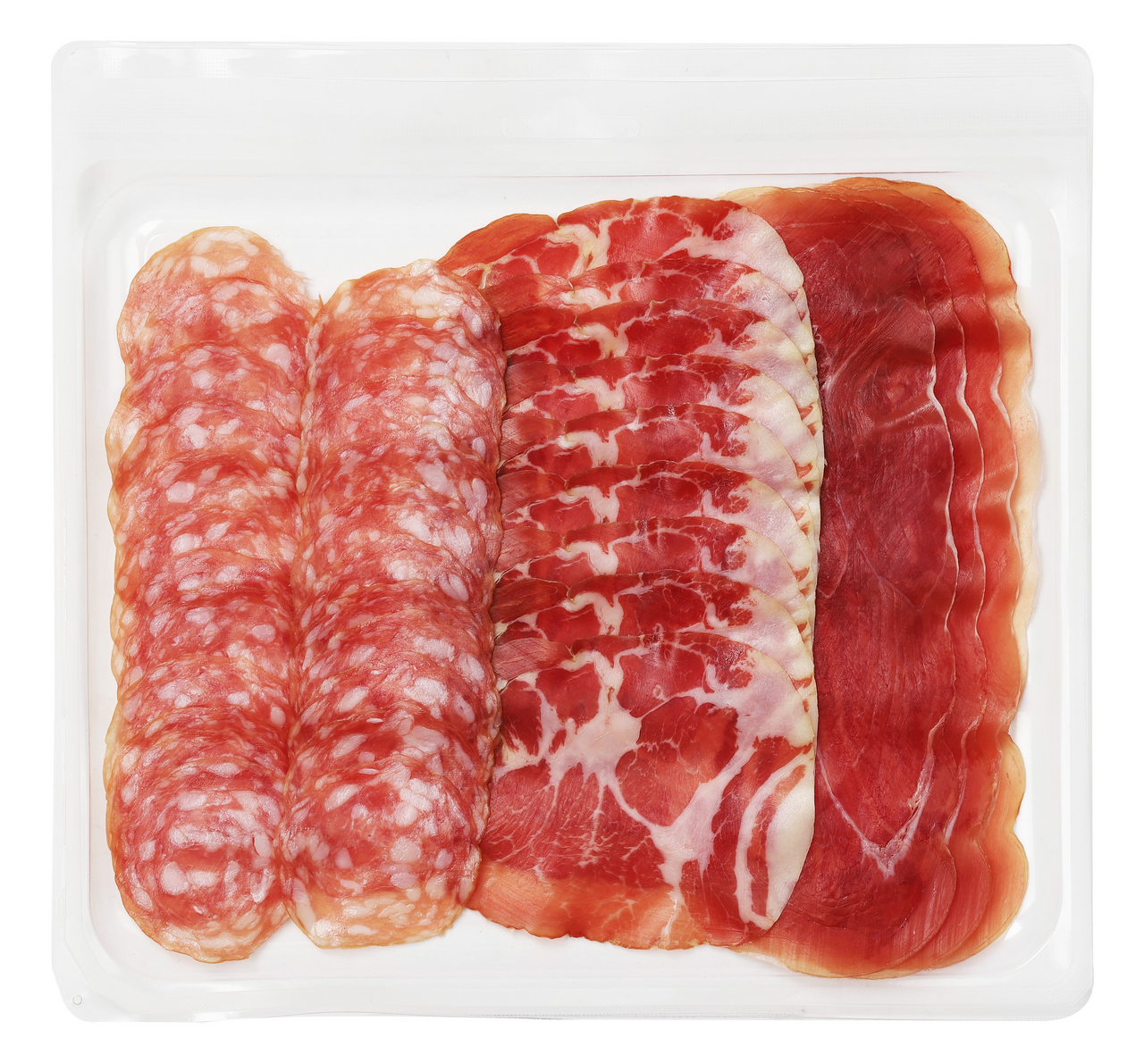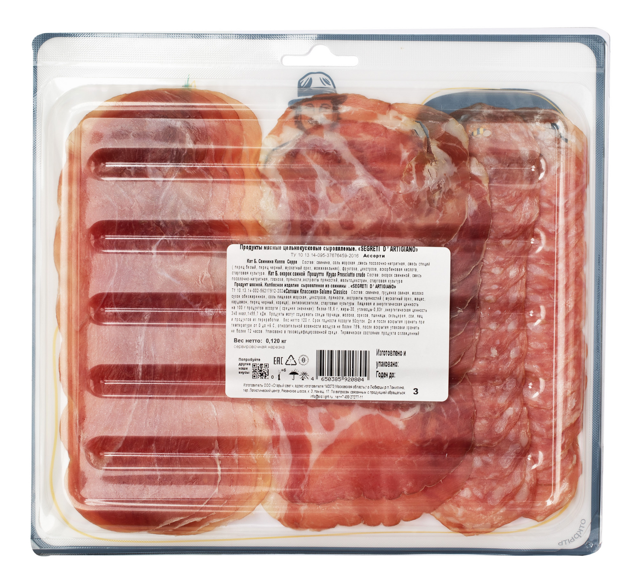 Прошутто Крудо Prosciutto: Окорок свиной, посолочно-нитритная, глюкоза, пряности, экстракты пряностей, мальтодекстрин, стартовая культура. Свинина Коппа Coppa: свинина, соль морская, смесь посолочно-нитритная, смесь специй (перец белый, перец черный, мускатный орех, можжевельник), фруктоза, декстроза, аскорбиновая кислота, стартовые культуры. Колбасное изделие сыровяленое из свинины Segreti d ’artigiano Салями Классико Salame Classico: свинина, грудинка свиная, молоко сухое обезжиренное, соль пищевая морская, декстроза, пряности, экстракты пряностей (мускатный орех, мацис, кардамон, перец черный, корица), антиокислители, стартовые культуры.
