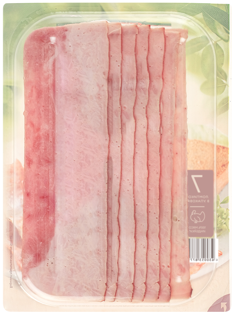 Филе грудки индейки, филе бедра индейки, вода, крахмал картофельный, посолочная смесь нитритная (соль, фиксатор окраски нитрит натрия), загуститель каррагинан, регуляторы кислотности: трифосфаты, пирофосфат натрия, мальтодекстрин, усилитель вкуса и аромата глутамат натрия, виноградный сахар, соль, антиокислители: аскорбиновая кислота, аскорбат натрия, изоаскорбат натрия, ароматизаторы, глюкоза ферментированная, специи (перец белый, горчица).