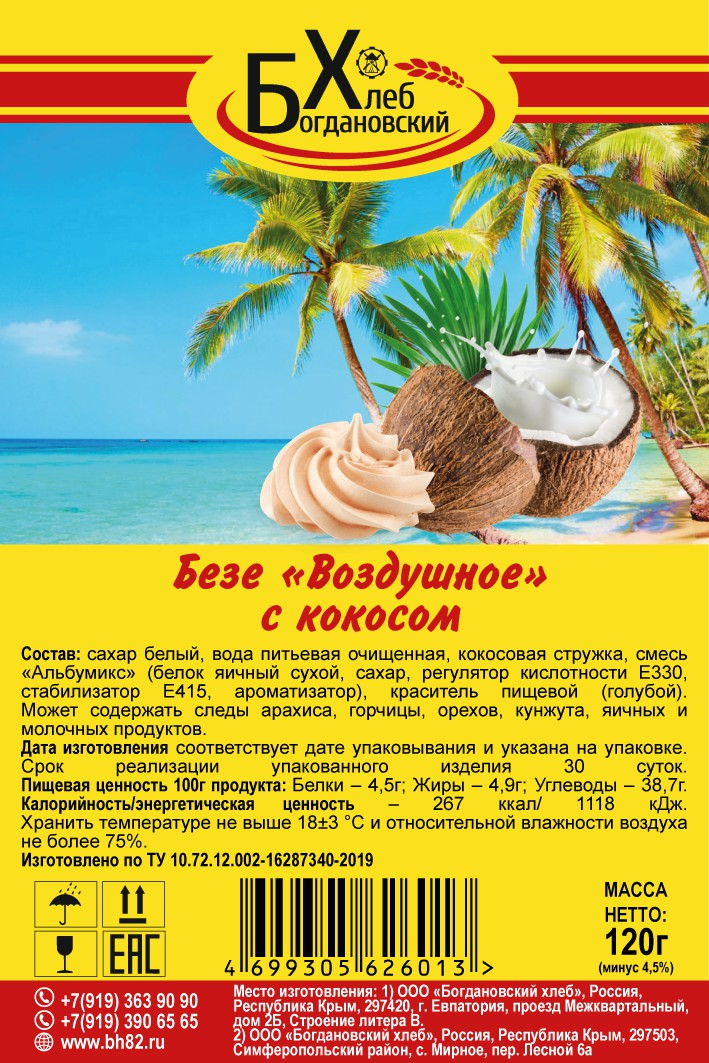 Безе Богдановский хлеб воздушное с кокосом, 120г