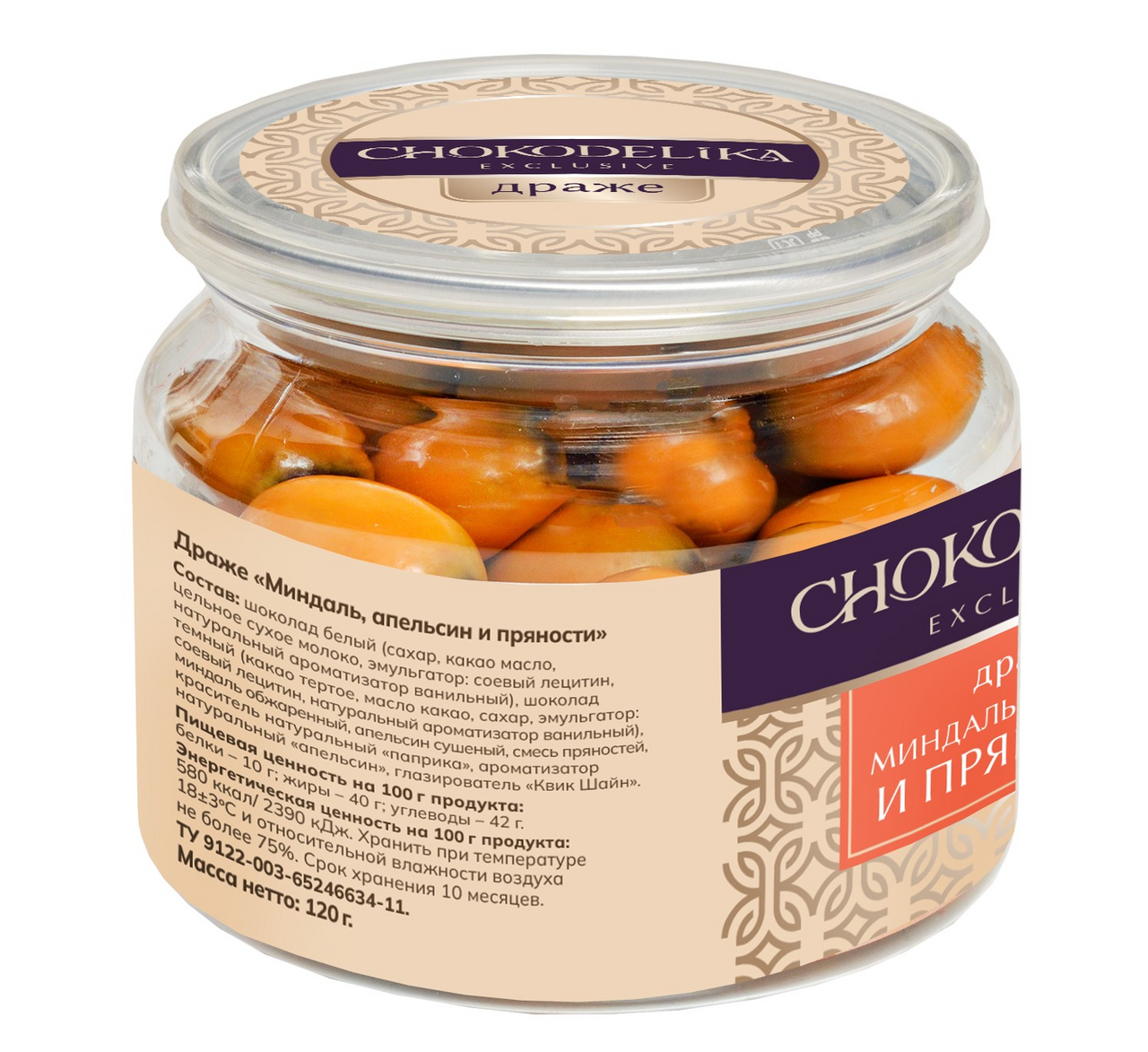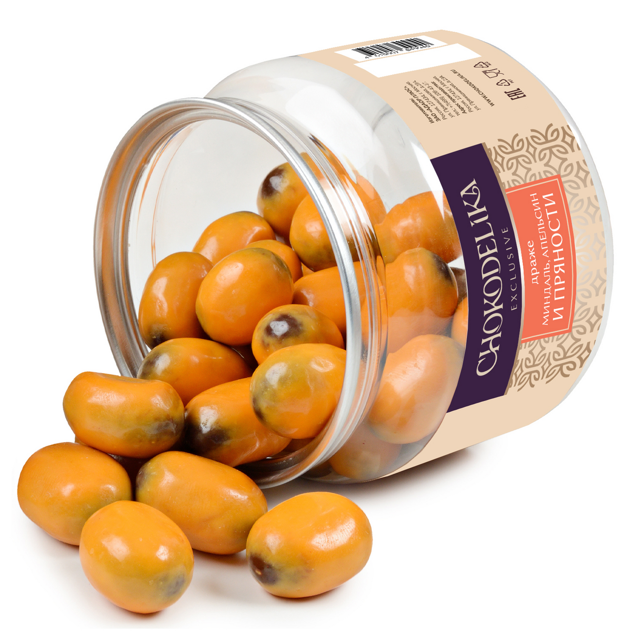 Настоящая сокровищница вкусов! Гармоничное сочетание цитрусового аромата с отборным миндалем и яркими пряностями делают это угощение шедевром шоколадного искусства! Драже имеет яркий оранжевый цвет, который напоминает о теплом летнем солнце. Пряности добавляют угощению особого шарма, его еще более привлекательным. Драже "Миндаль, апельсин и пряности" можно употреблять как самостоятельный десерт или добавлять в другие блюда. Оно отлично подходит для тех, кто хочет разнообразить свой рацион и получить заряд энергии и витаминов.