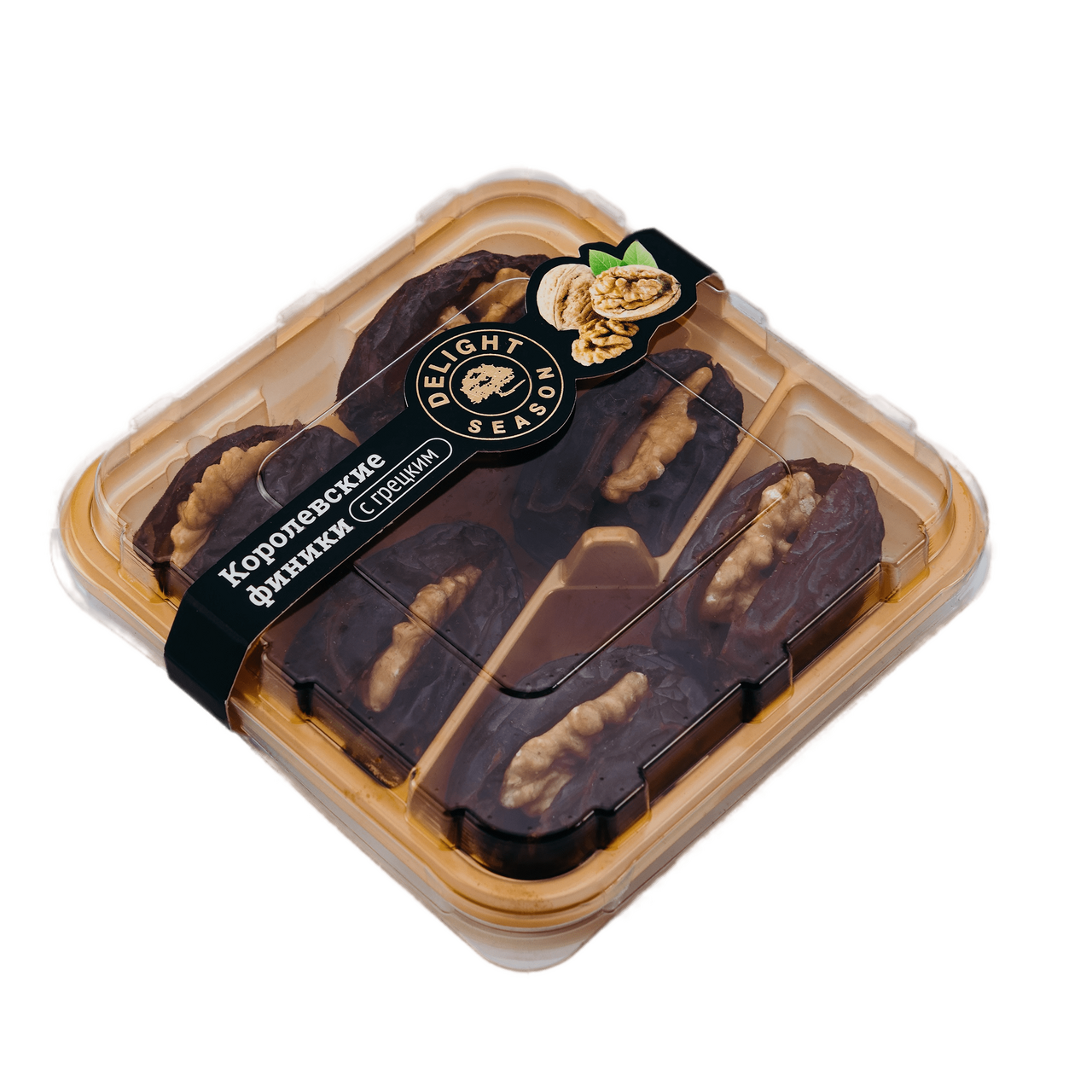 Эти специально отобранные финики премиального сорта не только гораздо крупнее обычных, но также имеют более насыщенный, тонкий вкус и мягкую, нежную текстуру. А начинка из половинок спелого грецкого ореха делает их ещё питательнее. Финики замечтельны и как полезное сладкое лакомство, и как оригинальный ингредиент блюд восточной кухни и разнообразных десертов.