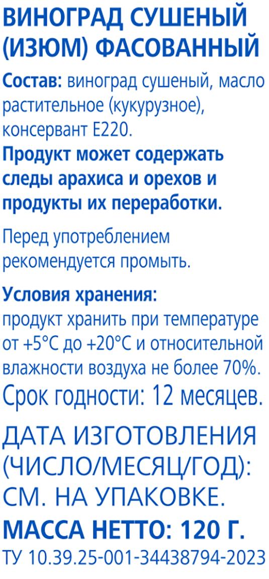 Виноград сушёный (изюм), растительное масло, консервант Е220.
