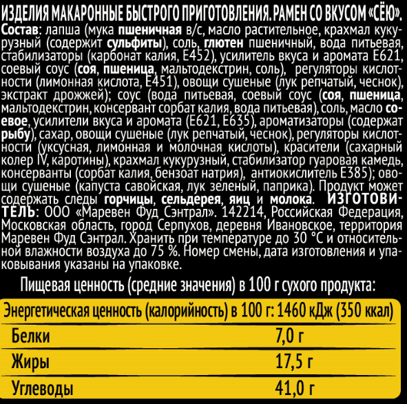 Лапша (мука пшеничная в/с, масло растительное, крахмал кукурузный (содержит сульфиты), соль, глютен пшеничный, вода питьевая, стабилизаторы (карбонат калия, Е452), усилитель вкуса и аромата Е621, соевый соус (соя, пшеница, мальтодекстрин, соль), регуляторы кислотности (лимонная кислота, Е451), овощи сушеные (лук репчатый, чеснок), экстракт дрожжей); соус (вода питьевая, соевый соус (соя, пшеница, мальтодекстрин, консервант сорбат калия, вода питьевая), соль, масло соевое, усилители вкуса и аромата (Е621, Е635), ароматизаторы (содержат рыбу), сахар, овощи сушеные (лук репчатый, чеснок), регуляторы кислотности (уксусная, лимонная и молочная кислоты), красители (сахарный колер IV, каротины), крахмал кукурузный, стабилизатор гуаровая камедь, консерванты (сорбат калия, бензоат натрия), антиокислитель Е385); овощи сушеные (капуста савойская, лук зеленый, паприка).