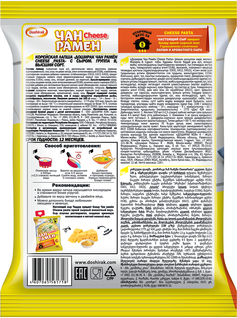 Традиционная корейская лапша Чан рамен Cheese pasta - новый тренд на простые и сытные блюда. Активность и мобильность не оставляют времени на домашнее приготовление сложных блюд - покупатели активно выбирают лапшу быстрого приготовления с сыром. Натуральный сыр в составе придает блюду яркий сырный вкус. Сыр добавляет блюду пикантные нотки и делает вкус более нежным и сливочным.